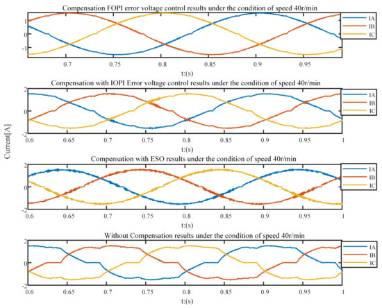 The comparison of A-phase current response experimental results under the 40 r/min speed conditions is shown in Figure 29 and Table 11. Compared with the method without compensation and optimal IOPI error voltage control, the dead-time compensation method with optimal FOPI error voltage control can significantly eliminate the current distortion and reduce the clamping of current around the zero-crossing point. The three-phase current clamping time of the method proposed in this paper is less than that of the compensation method using ESO.