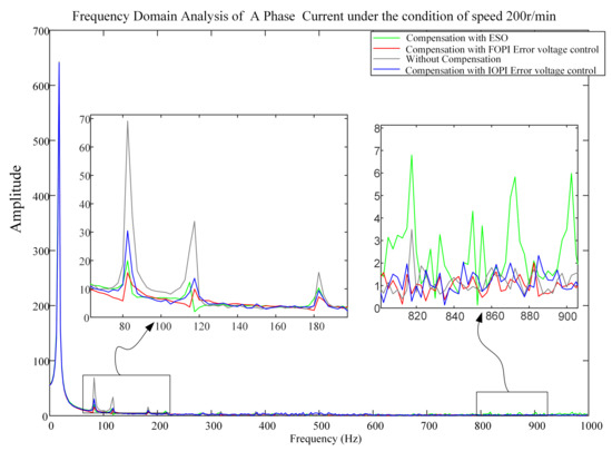 Frequency domain analysis of A phase current under 200 r/min speed conditions (the proposed method, the method with optimal IOPI error voltage control and the method with ESO).