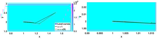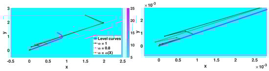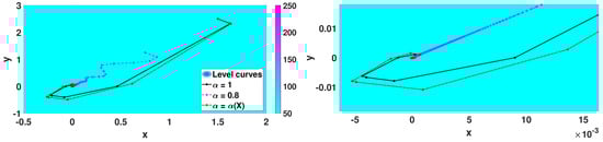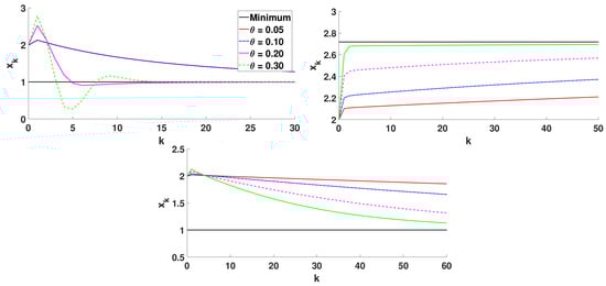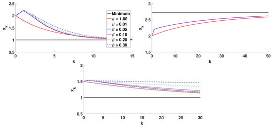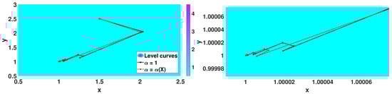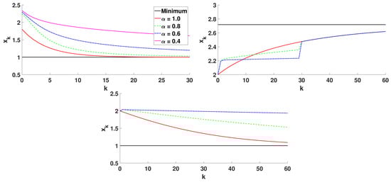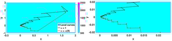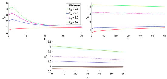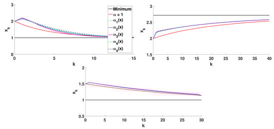 In Table 1, we present the information concerning the iterates of the implemented algorithms. When we consider , we achieve the global minimum point in the three cases; however, it is clear that Algorithm 2 leads to the worst results in terms of speediness, whereas the classical case and Algorithm 3 have similar results. If we consider and we restrict our analysis to the two fastest algorithms, we conclude that, in this case, Algorithm 3 provides a more accurate approximation in fewer iterations. We point out that the objective function is a function with less convexity near the minimum point when compared with the objective function , which leads to an optimization problem that is more challenging under the numerical point of view.
