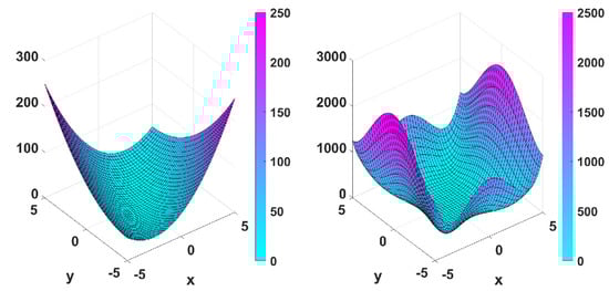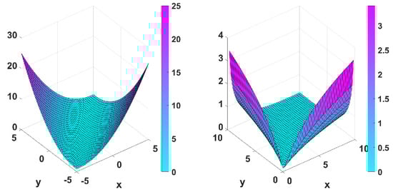 The function is a classic convex quadratic function in and can be considered an academic example for implementing our algorithms. The choice of functions and is due to the fact that they are benchmark functions used to test and evaluate several characteristics of optimization algorithms, such as convergence rate, precision, robustness, and general performance. More precisely, the Matyas function has a plate shape and the Wayburn and Seader No. 1 function has a valley shape, which implies slow convergence to the minimum point of the corresponding function. For the functions in the vector function we consider the choices