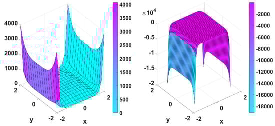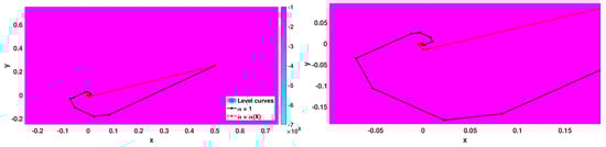 In the final set of figures and tables, the function is composed with and . Taking into account the results obtained previously for the Matyas function, where it is clear that Algorithm 2 leads to worse results in terms of rapidness and accuracy, we only implemented the classical gradient method and Algorithm 3. The following figure shows the graphical representation of with local minimum at the point and with local maximum at (or a local minimum of the function ).