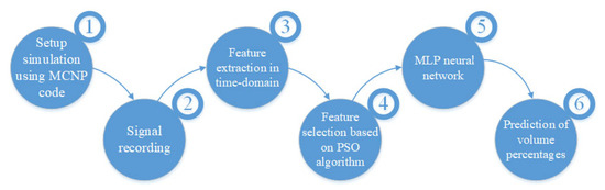 In this manuscript, a diagnostic instrument comprising two sodium iodide detectors, a cesium radioisotope, and a pipe under test were simulated with MCNP code. The angle between the two detectors was 13° to record the received signals with the least interference. Three different flow regimes were simulated at 18 different volume percentages. 13 temporal characteristics were extracted from the signals of two detectors, and a total of 26 characteristics were collected from all tests. The extracted features were given to the PSO-based feature selection algorithm to select the optimum mixture of them. Many PSO-based FS methods have been developed in recent decades [63,64,65].