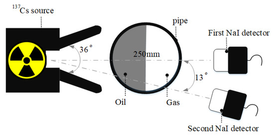 These three environments (annular, stratified, and homogeneous) were simulated using the MCNP method in a static environment. Figure 2 illustrates a schematic of simulated regimes. Figure 3 depicts the simulation apparatus, which consists of a 137Cs source and two detectors measuring 254 × 254 mm, positioned 250 mm from the source. In order to produce a wide beam, the collimator’s opening angle has been set at 36°. Both the first and second detectors were positioned at an angle of 13° with regard to the source. Significant simulation work has been done before [3]. In that study, the optimal placement was found by maintaining one detector at an angle of 0° and varying the direction of the other detector from 7° to 18°. There is no mutual interference between detectors if they are set at an angle of 7° or more. The highest angle at which gamma rays may travel through the pipe and reach the second detector is 18°. Several volume fractions were simulated in each setting. This research demonstrated that the first and second detectors should be placed at an orientation of 0° and 13° with regard to the pipe’s diameter, respectively, to minimize interference between the different flow regimes. Based on previous research [3], the detectors’ position and orientation have been chosen for this investigation.