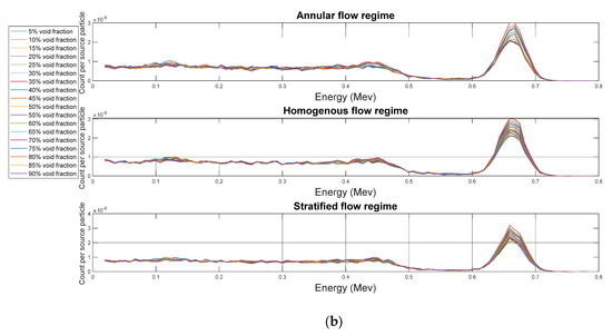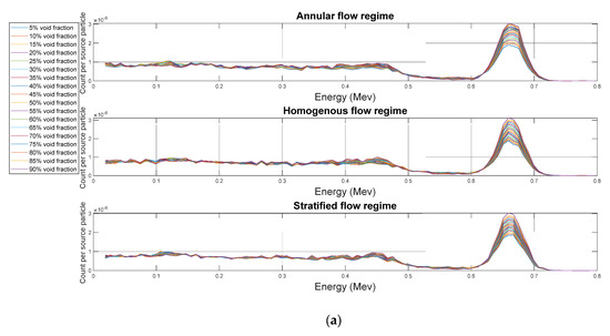 Gasoil (with the formula C12H23 and the density of 0.826 g/cm3) and air (with the density of 0.00125 g/cm3) were selected as the liquid and gas phases, respectively, for this investigation. All three flow patterns have been simulated 54 times, with each run simulating a void fraction ranging from 5% to 90% (with a step size of 5%). Multiple experiments performed in the prior study [3] confirm the structure being explored here. With several tests carried out in our earlier investigations, the structure under investigation in this study has been verified [3]. It was discovered that these outcomes follow each other by contrasting the simulated and measured output of the detectors. For the purpose of comparing the experimental and simulation data, both the simulated and measured results were normalized to the unit. A maximum relative discrepancy of 2.2% existed between the simulated and measured findings. The simulations and subsequent experiments were conducted in a static environment. While the real working environment is inherently dynamic, it could be conceptualized as static because of the set training reference points used by the flowmeter. The flowmeter was “trained” using these reference points to do volume fraction calculations, and to distinguish between flow regimes in a multi-phase flow meter in the operation. Multiphase oil, gas, and saltwater flow detection using gamma-ray neutron activation analysis was studied in ref. [20]. All of the simulations utilized in this work were first examined in a static environment before being applied to actual conditions. For the purpose of determining the salinity in the produced water, [21] the study analyzed transmitted and scattered gamma radiation. The simulations were all static, yet they were all employed in actual situations.