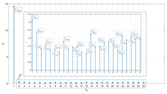 One of the important elements of implementing optimization systems is defining the cost function. Considering that the PSO is an algorithm for solving continuous problems, to use this algorithm in a discrete problem, such as feature selection, we have first generated a continuous random key, and the location of this data (datum number) has been considered as a permutation. This permutation is set in such a way that the continuous data are sorted from the smallest to the largest, and are selected by considering the number of desired features from the beginning of this permutation. In other words, the trick used in this research was to use the location of continuous data as discrete data. The mean squared error (MSE) of a multilayer perceptron (MLP) neural network with a single hidden layer and 10 neurons in the hidden layer is used to calculate the cost function of the PSO system in this study. In this way, first, a number of inputs are randomly applied to the network from all the extracted characteristics, and the defined optimization system advances the inputs toward optimal inputs in order to reduce the defined cost function. PSO systems are designed in such a way that they attempt to forecast the goal using some identifying feature, and then gradually expand the number of inputs until the system is fully implemented across all possible modes. The cost function’s value, as a function of the number of Inputs, is demonstrated in Figure 5. According to this figure, by choosing one input, the cost function’s value is high, and with the increase in the number of entries, this value decreases. However, the point that is very important here is that by increasing the number of inputs to more than eight, the value of the cost function increases. Although the selection of 13 and 14 inputs has a small effect in reducing the cost function, this small effect cannot be considered due to the imposition of a large number of inputs to the system, and the selection of eight inputs was chosen as the most optimal mode. By checking the inputs, the characteristics of: 4th order moment; MSR; STD; skewness; ASS; mean value of signal recorded by the first detector and 4th order moment; and variance of the signal recorded by the second detector, have been introduced as 8 selected characteristics in the FS section: