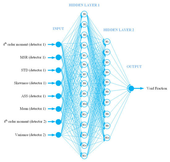Recently, a wide range of computational methods has been applied to specific problems in engineering research [38,39,40,41,42,43,44,45,46,47,48,49,50,51,52,53,54,55,56,57,58,59,60]. In this study, ANN was implemented to estimate the components of a two-phase flow. The most popular kind of ANN, multi-layer perceptron (MLP) models are employed in many applications. They learn the mappings between nonlinear functions and the many possible nonlinear decision surfaces. The following equations describe how to achieve neuron output in the output layer [61,62]: