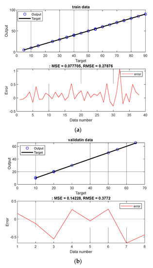 After defining the efficient features, the MLP neural network was trained with these features to estimate the gas percentage inside the pipe. As depicted in Figure 6, this network has eight inputs, two hidden layers, and one output. The hidden layers’ neurons are 15 and 10 neurons, respectively. Table 2 shows the implemented MLP specifications. To illustrate the network’s efficacy throughout the training, validation, and testing datasets, Figure 7 includes two error and regression diagrams. The network’s output (blue circles) and the desired outcome (black line) are shown in the regression diagram. The precision of the planned network is shown by their mutual compatibility. The error diagram graphically displays the deviation between target value and neural network’s output. Two error criteria (named MSE and RMSE, respectively) for data in the training, validation, and testing stages were calculated. The maximum value of MSE and RMSE is equal to 0.14 and 0.37, respectively. Table 3 compares the capability of the provided system with that of earlier studies, demonstrating the impact of feature extraction on the precision of the volume percentage detection method. Useful characteristics were picked as inputs to the NN using the PSO-based approach, which allowed for the great accuracy attained in this study. The use of optimization methods in the selection of suitable features is the innovation of the current research, which has caused a significant reduction in the error in the volumetric percentage detection system.