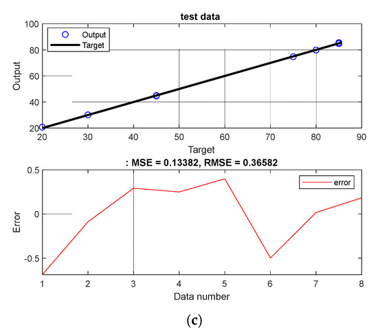 Results of the NN on three different types of data: (a) training, (b) validation, and (c) testing.