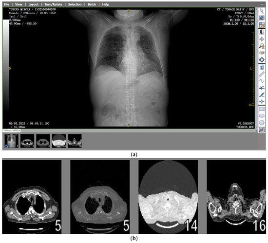 (a) The CT scan image of a 69-year-old patient who underwent a chest CT examination due to suspicion of COVID-19 in the lungs. (b) A schematic representation of the pre-processing phases of the patient’s CT image (2D), which was resampled to an isomorphic resolution. The indices 5, 14, and 16 represent the numbers of the slices in order.