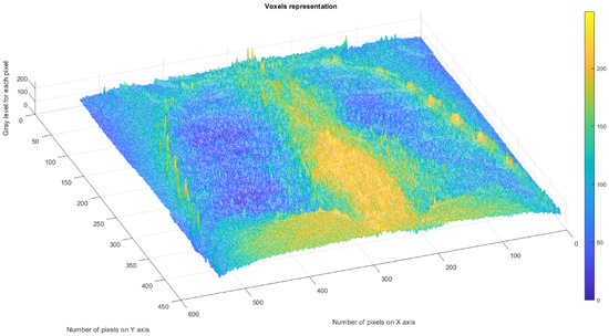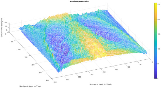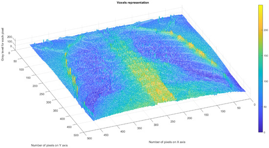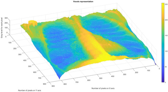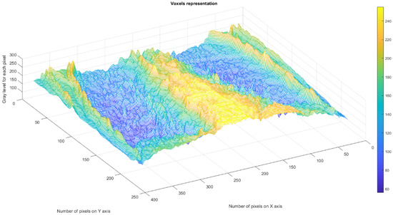 Figure 11 depicts the 3D graphical representation of the voxels present in the CT lung image of patient 2. EF. A voxel is a 3D pixel model that, unlike a simple square, is a perfect cube. This modeling technique is theoretically perfect for replicating reality on a large scale. Voxels are currently used in science to accurately and rapidly highlight volumetric data [24,25]. In voxel-based morphometry, concentration differences in pulmonary tissue can be compared using voxels, as shown in Figure 11.
