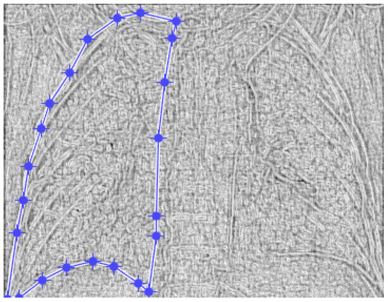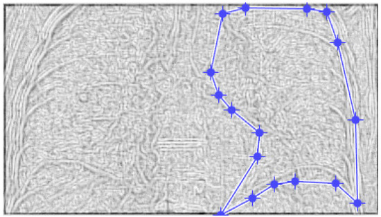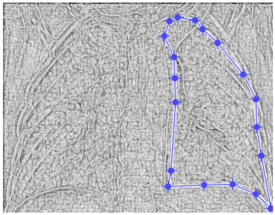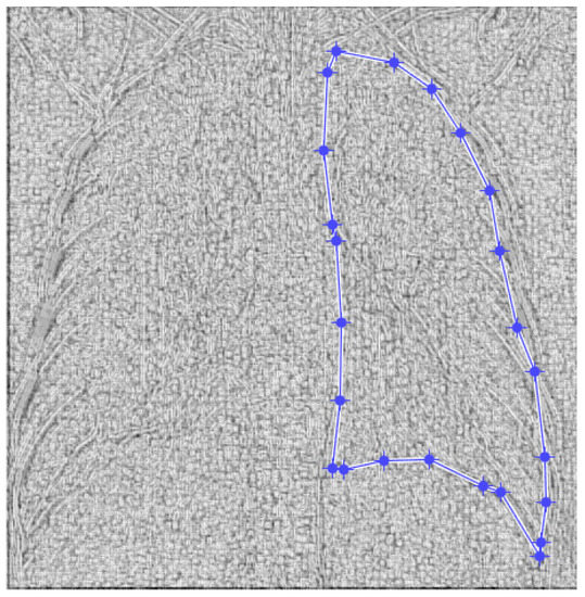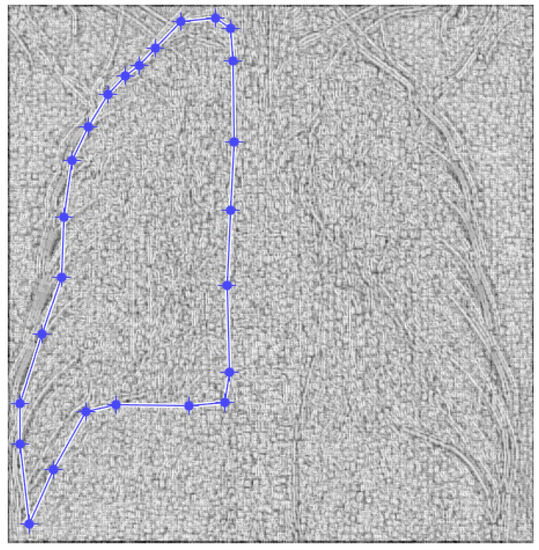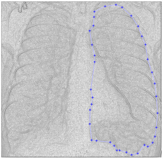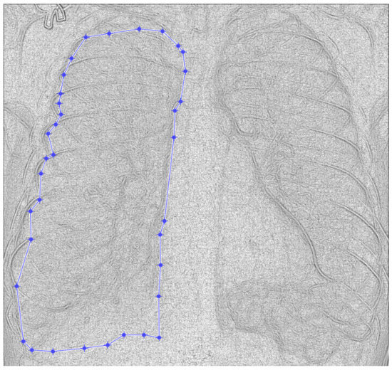 Figure 9 and Figure 10 present the defined masks for the left lung and right lung, framed in blue borders.