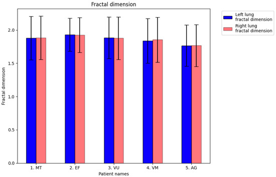 The calculations performed revealed fractal dimension values higher than 1.7661 and lower than 1.9263 for patients infected by SARS-CoV-2. The perfectly healthy patient had the lowest value for the average fractal dimension of the lung CT image. More precisely, for the CT image of the left lung, it was 1.6410 ± 0.3577, and Λ = 0.0475; and the fractal dimension of the right lung was 1.6318 ± 0.3598, and Λ = 0.0486.