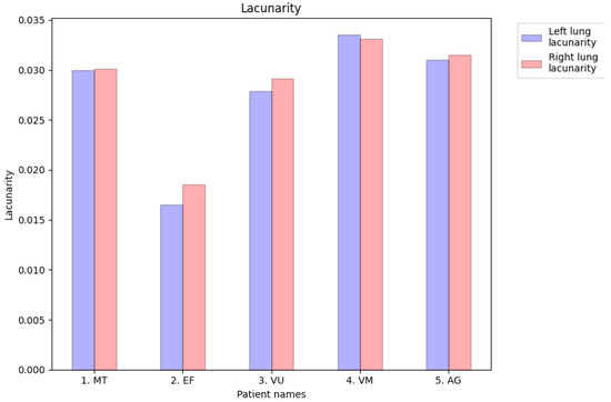 Lacunarity values of CT images of the left lungs and right lungs of affected patients to compare them with those of pulmonary controls.