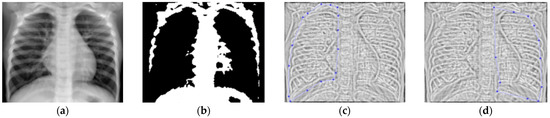 (a) Healthy lung image, (b) binary version, (c) mask for the left lung, (d) mask for the right lung.