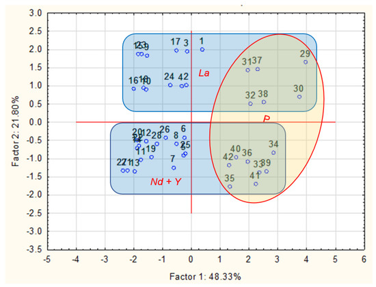- over PC2, data placed on top (above PC1) are La2O3–doped Al2O3 while the ones below PC1 are Y2O3–doped Al2O3 and Nd2O3–doped Al2O3;