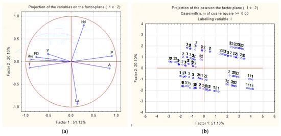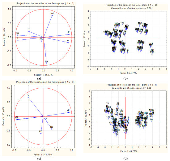 - observed projections on the plot’s left side are controlled by (T + ρ). The higher the value of the projection on the PC, in absolute value, the stronger the influence of the corresponding variable.