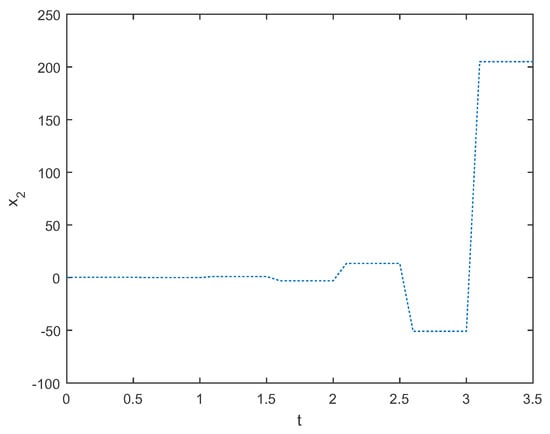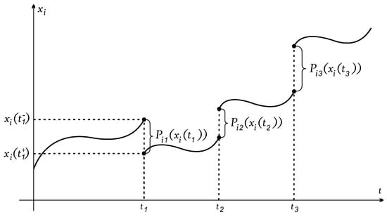 where , , are the instances of impulsive perturbations at which the density of a neuronal cell shifts from the amount of into the number , and are functions that characterize the size of the impulsive control effects of the states at the moments . A graph of the trajectory of a state is shown in Figure 1.