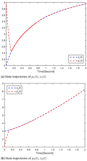 The time T is calculated by Theorem 2, which means that (37) and (38) can achieve synchronization in a finite time T. Furthermore, here .
