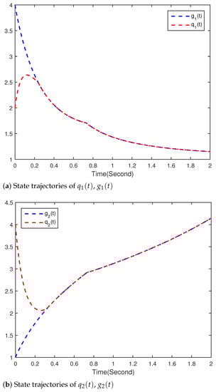 Figure 2, Figure 3 and Figure 4 show the simulation results of the drive(33) and response(34) system. Figure 2 and Figure 3 show the trajectories of states and , and and , respectively. Equation (34) indeed converges to (33) with the controller (35) in T, and the convergence error continues to remain zero. The time evolution of synchronization errors and between systems (33) and (34) are presented in Figure 4. Simulation results show that the main results of the finite-time synchronization entrenched are correct in this article.