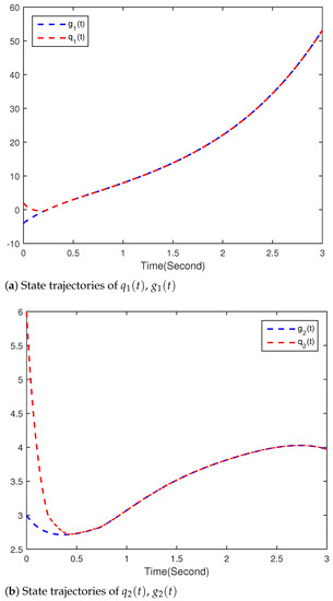 Figure 5, Figure 6 and Figure 7 show the simulation results of the drive(36)-response(37) system. Figure 5 and Figure 6 show the trajectories of states and , and , respectively. Equation (37) indeed converges to (36) with the controller (38) in T, and the convergence error continues to remain zero. The time evolution of synchronization errors and between systems (36) and (37) are presented in Figure 7. Simulation results show that the main results of the finite-time synchronization entrenched are correct in this article.