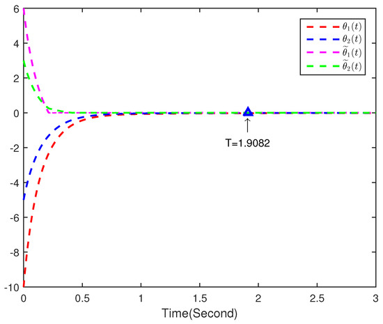 The time T is calculated by Theorem 1, which means that (34) and (35) can achieve synchronization in a finite time T. Furthermore, here .