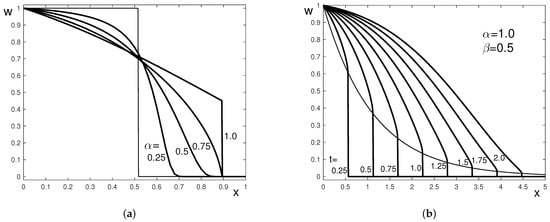 Figure 2a corresponds to the Mittag–Leffler-type kernel (65) with and different values of , . Figure 2b corresponds to the distributed-order kernel (66), a takes different values in the interval , , . In Figure 2, the propagation function is plotted as a function of x. Since for the considered kernels, the propagation function is smooth at the wave front.