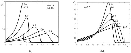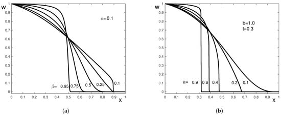 In all figures, except Figure 2b, the parameters a and b are taken , which corresponds to a constant propagation speed, . Therefore, in these figures, vanishes for and vanishes for .