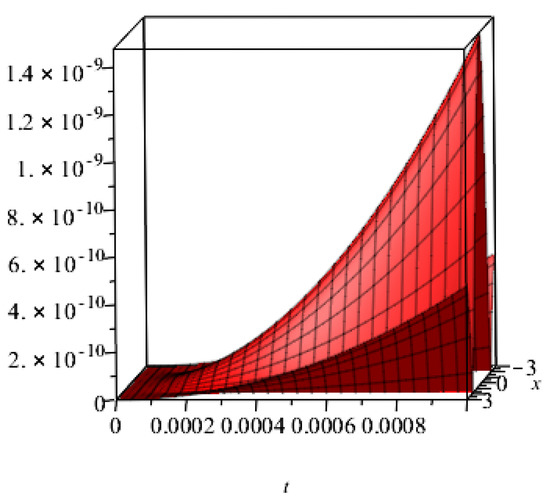 An approximate analytical solution to the is provided in this section. The method’s applicability is demonstrated by the numerical results, and its correctness is assessed in comparison to exact results. Application of our method produces a good performance and simple results that can be easily implemented. The exact solution plot, which is shown in Figure 1, was compared to the solution plot of . Figure 2 displays the graphical representations of for and . Similarly, Figure 3 displays the plots of for various values of , while Figure 4 displays the behaviour of the absolute error for the same equation derived using both methodologies. The approximate solution to the equation is shown in Table 1 for various values of and , while the absolute error comparison is shown in Table 2 for various values of and . It should be mentioned that we obtained a good approximation with the exact solution of the stated problems and that we employed third-order approximate solutions throughout the computations. If we increased the order of the approximation, which would increase the number of terms in the solution, better approximation solutions would be found.