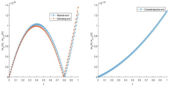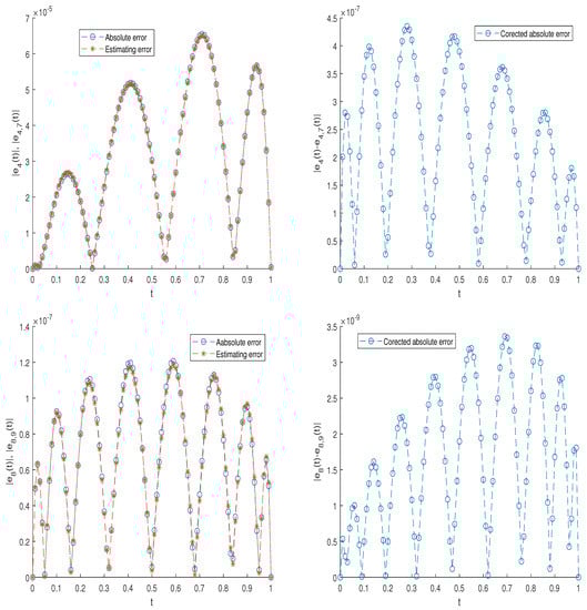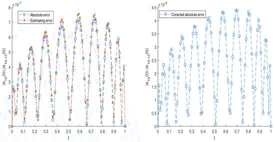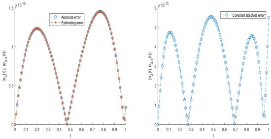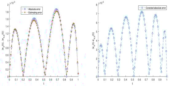 For , the error and the error estimation of Example 2 and the corrected error results are drawn in Figure 2.