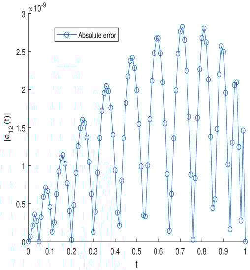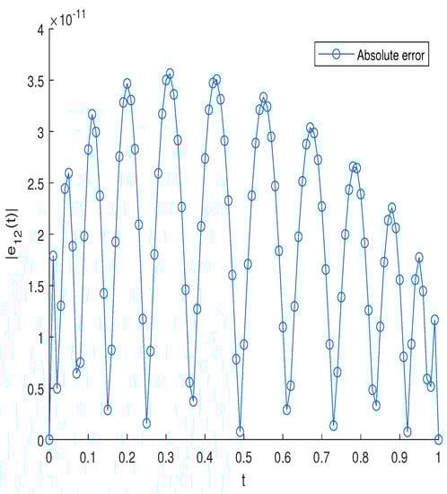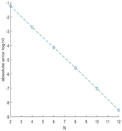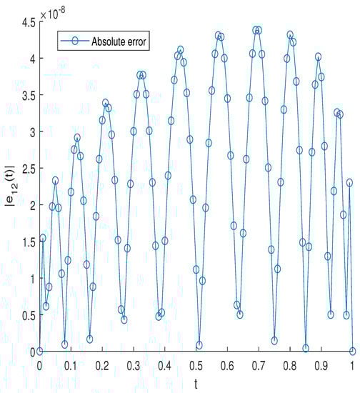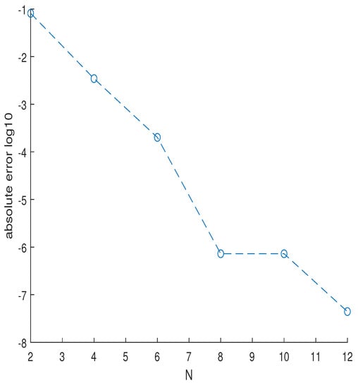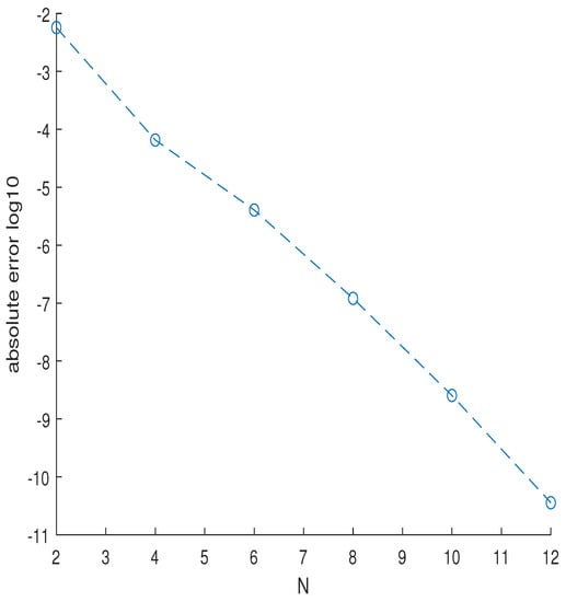 The results for are given in Table 6 and Figure 11 with a comparison to the approximate solutions obtained by the methods in [,]. In addition, Figure 12 displays Log of absolute errors for and different values of N. We conclude that, as in the other examples, more accurate results are obtained by increasing N. The approximate values of for , and some values of ν, are given in Figure 13. The absolute error, with its estimation, and the corrected absolute error for Example 5 are drawn in Figure 14 for . The estimation absolute error for Example 5 are drawn in Figure 15 for and .