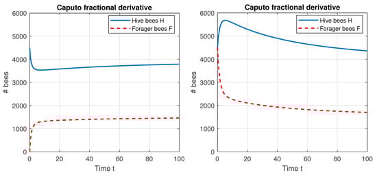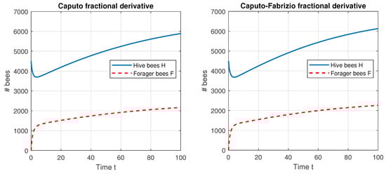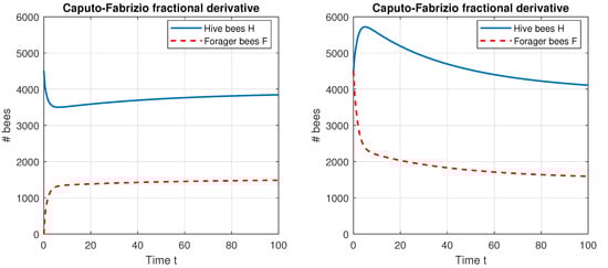 A possible continuation of the current work is to employ different fractional operators or more sophisticated models; as in, for example, [,]. Another interesting problem is obtaining reasonable values of the fractional orders. A way to achieve this is to use an approach similar to the bisection method []. Nevertheless, it is an open field to discover and might be a matter of further research. We believe the current and future algorithms give insight into managing honeybee colonies and help solve contemporary ecological and environmental issues.