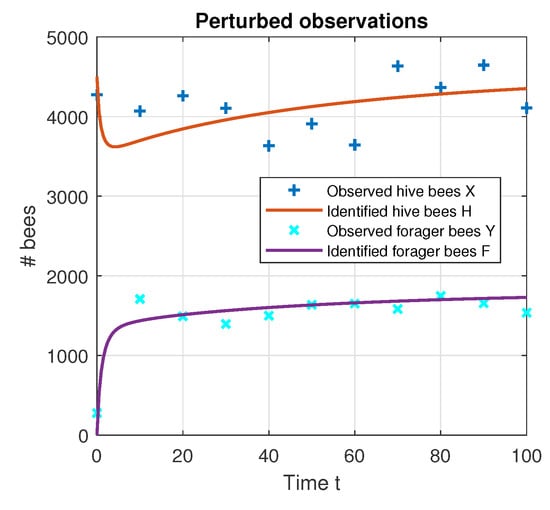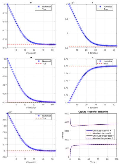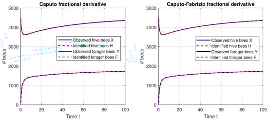 In this case, 39 iterations were performed to reach convergence. The relative errors of the recovered parameters were a bit higher that those of the Caputo model, but the residuals , were a bit smaller, as were the root mean squared errors and , respectively. The two calibrations demonstrated similar results, which indicated that both the Caputo and the Caputo–Fabrizio derivatives are adequate for modeling the honeybee fractional population dynamics.
