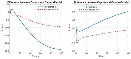 Differences between Caputo and Caputo–Fabrizio models with (left) and (right).