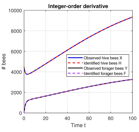 On the other hand, fractional-order models have been recognized as a powerful mathematical tool to study anomalous behavior observed in many physical processes with prominent memory and hereditary properties. Thanks to the memory effect, which represents an advantage of the fractional derivative compared to the ordinary derivative, the theory and the application of fractional calculus have been widely used to model dynamic processes in the fields of science, engineering and many others. The last decades, especially, have seen a rapid development, both in theory and applications, of fractional ordinary differential equations, as in, for example, [,,,,], and the application of fractional-order derivatives in biological phenomena [,]. However, to our knowledge, literature dedicated to modeling honeybee population dynamics via fractional-order derivatives is quite scarce. For instance, to investigate the causes of colony collapse, the author of [] proposed a fractional honeybee colony population model. We adopted this model to demonstrate the solution approach to the inverse parameter reconstruction problem.