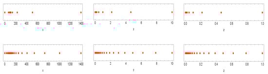 The procedure for the discretization nodes which are on the boundaries is given along the spatial variable x, while it is similar for the other spatial variables of the PDE problem (3). The formulations (17)–(19) and (21)–(22) are fruitful from the second row to the second-to-last row, while for the first and final rows of (28) and (29), the weights are not valid on boundaries and sided estimations must be incorporated. Thus, using [25] for the stencil { x 1 , x 2 , x 3 } , we have: