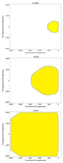 Figure 2. The numerical stability region of (44)–(46) for different values of ζ , i.e., ζ = 0.005 , ζ = 0.002 and ζ = 0.001 .