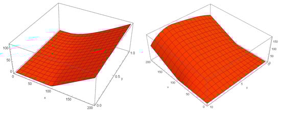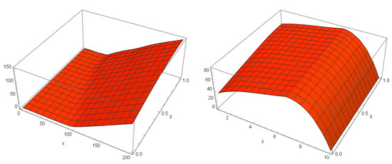 Figure 3. Numerical solution of the HCIR PDE in Case II. Top-left: for u ( x , y , 0.024 , 1 ) on 0 x 200 , 0 y 1 , Top-right: for u ( x , y , 0.024 , 1 ) on 0 x 200 , 0 y 10 , Bottom-left: for u ( x , 0.04 , z , 1 ) on 0 x 200 , 0 z 1 and Bottom-right: for u ( 100 , y , z , 1 ) on 1 y 10 , 0 z 1 .
