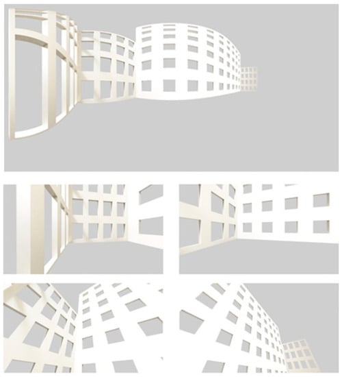 The 360-degree spherical perspective relates to the fractal by also providing potential for compression (see, e.g., [35] (p. 458)). A 360-degree spherical perspective image contains a (theoretically) infinite amount of straight–linear perspective images (see exemplary selection in Figure 3). These also constitute mappings with a higher degree of abstraction in relation to human perception than curvilinear perspective representations. However, this research does not evaluate which vanishing point perspective model or box-counting method does capture the actual human experience best. The 360-degree spherical perspective is thereby regarded as a specific topological fingerprint of a specific viewpoint in relation to surrounding objects, such as buildings and vegetation.