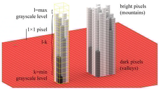 The standard box-counting method is well-suited for (vector-based) elevations of façades, but it has weaknesses when measuring color images or photographs in general (e.g., they have to be turned into black-and-white images using a certain threshold first). The so-called differential box-counting method [40] was developed to close the gap insofar that grayscale images can be analyzed and not just black-and-white images. With this method, the image is interpreted as a three-dimensional landscape, with the grayscale level defining the z-coordinate (see Figure 4), where the bright pixels form the mountains and the darker pixels define the valleys. Finally, to apply the box-counting method to grayscale images, three-dimensional cubes are used for the grid instead of two-dimensional boxes; in other words, a dimension for the grayscale level is added. The size of a single cube in the grid is, therefore, ( × × ) for a square image ( × pixels), where () are pixels and () are grayscale levels. This results in a dependency of the value () on the total number of grayscale levels () where the following applies: