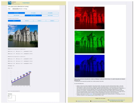 Differential box-counting of the web application “FRACAM”, showing the castle of Ghent, Belgium. (Left top, left middle): results, with = 0.471, = 0.470, and = 0.466; with = 0.471, = 0.999949, and = 0.999921; = 2.469; = 3.408; (left bottom): used box sizes; (right side): RGB separation.