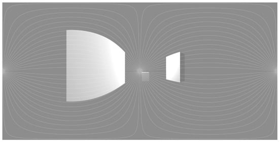 To scrutinize the influence of object complexity regarding the fractal dimension in 360-degree spherical perspective images, the production of such images in CAAD software as a controlled environment was applied. The software Blender allowed for an easy export of spherical images based on a 3D model and a defined camera position and viewing angle. The default dimensions for the exported representations were changed to an image proportion of 1 to 2. To verify the underlying formula for the calculation of the image in Blender, an overlay of the spherical grid, as described by Kulcke (for more details, see [34]), over an exported image was used for positive visual verification (Figure 6).