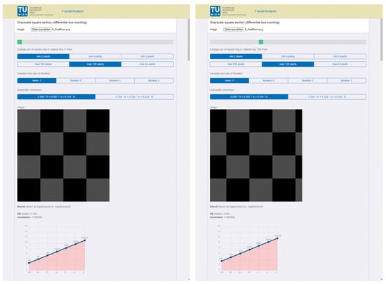 Once the checkerboard squares no longer matched those of the grid, the box-counting dimension changed. This became clear with the “Grayscale DBX M × M (m × m)” method—in which only a square section is considered—when the section was shifted accordingly (see Figure 7).