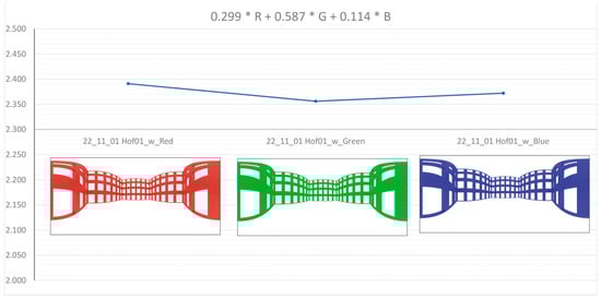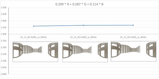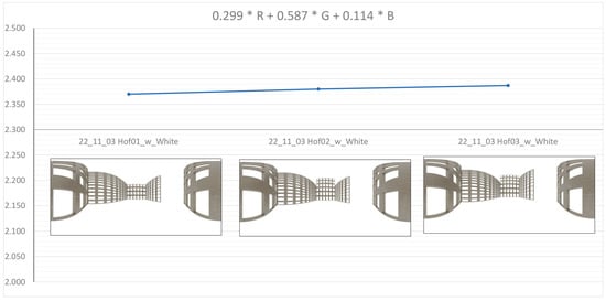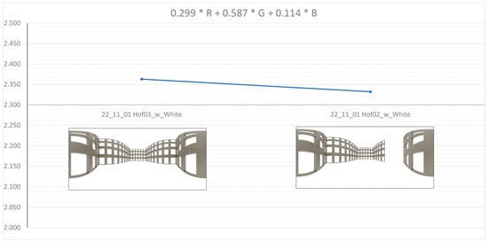 First, the grayscale calculation was performed with the previously described algorithm “Grayscale DBX M × N (m × m) (shifting boxes)”. It turned out that for the versions of façades colored with different gray values, there are only minor differences between the two different grayscale conversions. In turn, and as expected, there were differences in the colored façades because the weighting of the brightness of the three color channels influenced the result but not the tendencies. The red-colored façades achieved the highest values, whereas the green ones achieved the lowest ones (see Figure 8).