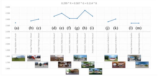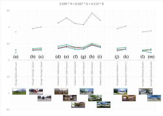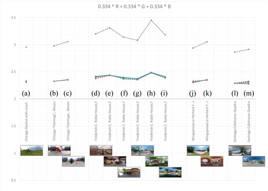 After the parametric test cases were completed, a total of 13 spherical photographs were analyzed. These examples originated from a field trip to Chicago and the surrounding areas in 2019 [48]. The selected motifs ranged from the Chicago skyline with a considerable portion of surrounding greenery to typical examples of the prairie style of Frank Lloyd Wright with its earthy tones showing both outside and inside, leading up to an example by Santiago Calatrava with large areas of white and a large area of the image taken up by (blue) sky. With these images, the application of the grayscale calculation of the adjusted conversion showed a clear tendency. Those examples that contained greater areas of similar color, either in the form of a high percentage of sky or greenery but also in the form of uniform coloring on these buildings, as was the case with the Calatrava example, had the lowest box-counting dimensions, as presented in Figure 12: