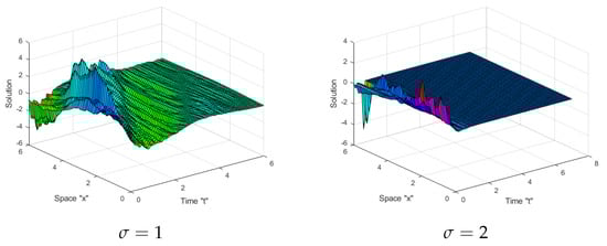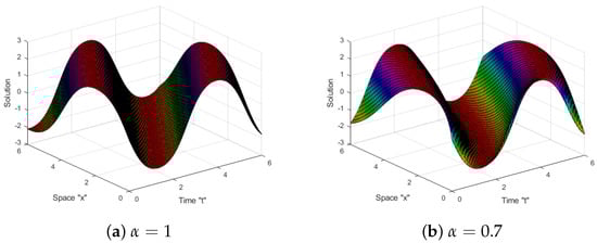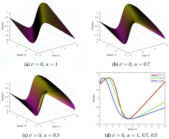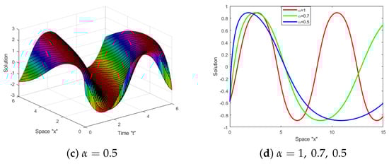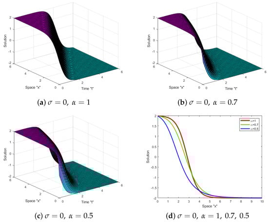 Next, we address the impact of the CD and BM on the exact solution of FSKMMS (1). We provide a number of graphs to demonstrate the current state of these solutions. For the obtained solutions, such as (16), (18), and (19), we simulate these graphs using the parameters , and .