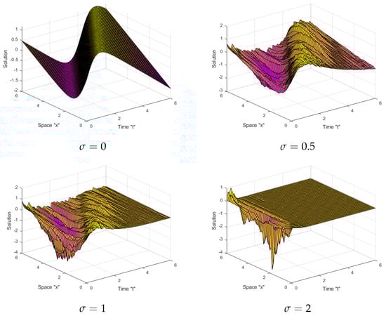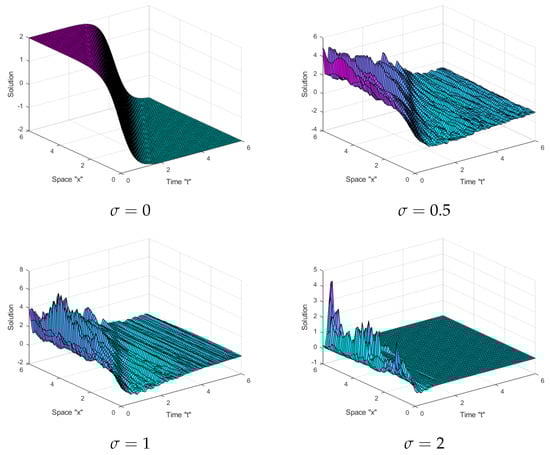 From Figure 4, Figure 5 and Figure 6, we may deduce that there are several types of solutions, including periodic ones, kinked ones, and others, when the noise is disregarded (i.e., at ). The surface becomes much flatter after a few minor transits once noise is added and its intensity is increased. Evidently, BM stabilizes the FSKMMS solutions.