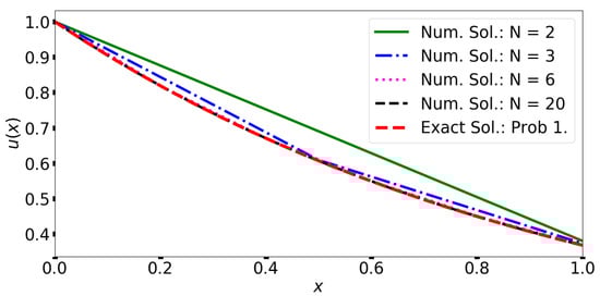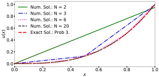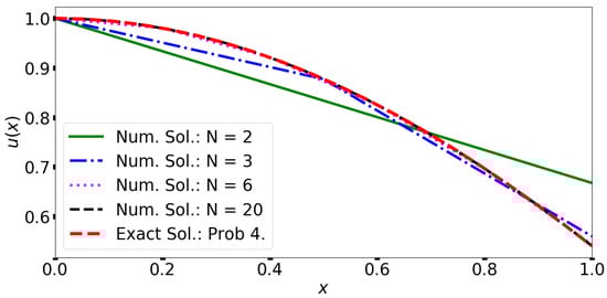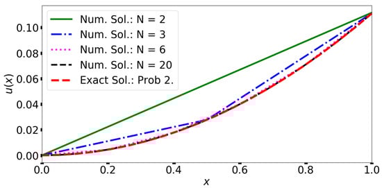 The exact solution of this problem is . It can also be seen in Table 3 that the numerical solution converges to the exact solution with second order of convergence. Moreover, Figure 3 demonstrates the convergence of the method as the grid is refined from just two points to twenty points. The proposed numerical scheme is clearly convergent. The astonishing feature of the method is that very high accuracy is attained even with very coarse grids.