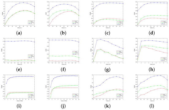(a–l) The PSNR and SSIM values with respect to the parameters , , p, K, , and r.