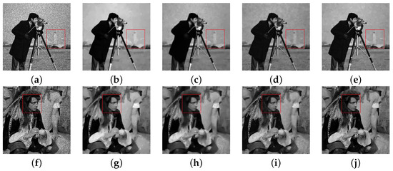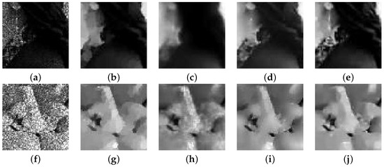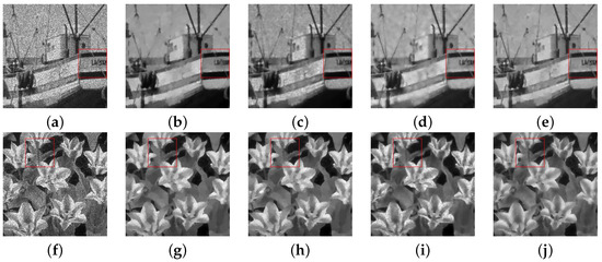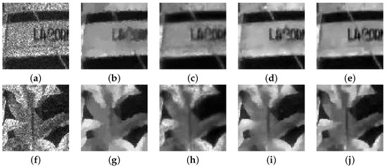 Recovery results of four algorithms on different images with the noise at : (a) Degraded. (b) CONVEX. (c) OGSTVD. (d) M-TGV. (e) NHOGSHL. (f) Degraded. (g) CONVEX. (h) OGSTVD. (i) M-TGV. (j) NHOGSHL.