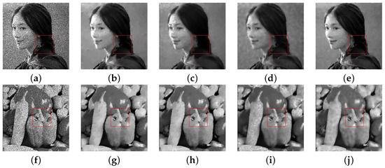 In this section, we conducted some experiments to verify the good performance of the proposed algorithm. Firstly, we gave the denoising results of the different methods a noise level of in Figure 3. Figure 3 shows that our method is more competitive in both visual effect and quantitative analysis. We selected the region of the images (the marked red box area in Figure 3) to enlarge to better observe the recovered image. As seen in Figure 3 and Figure 4, our method provides superior recovery for the structure of the restored image. Next, in Figure 5 and Figure 6, the recovery images of “Boats” and “Tulips” are shown for four different methods at a noise level of . The other compared methods produce staircase artifacts and lose a lot of detail, while our method successfully overcomes the above shortcomings. Finally, under the noise level , the recovered images of “Lin” and “Peppers” by the different methods are shown in Figure 7 and Figure 8. As can be seen in the figures, our method has a great advantage in restoring sharp edges, such as the earrings of “Lin” and the terriers of “Peppers”. Compared with the two models, M-TGV and our method have better performance in restoring detail information and texture structure. Compared with the M-TGV method, our method can restore more details and textures.